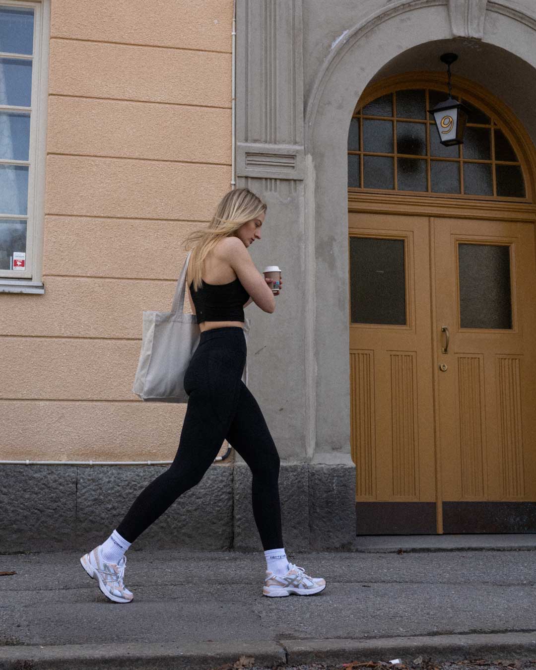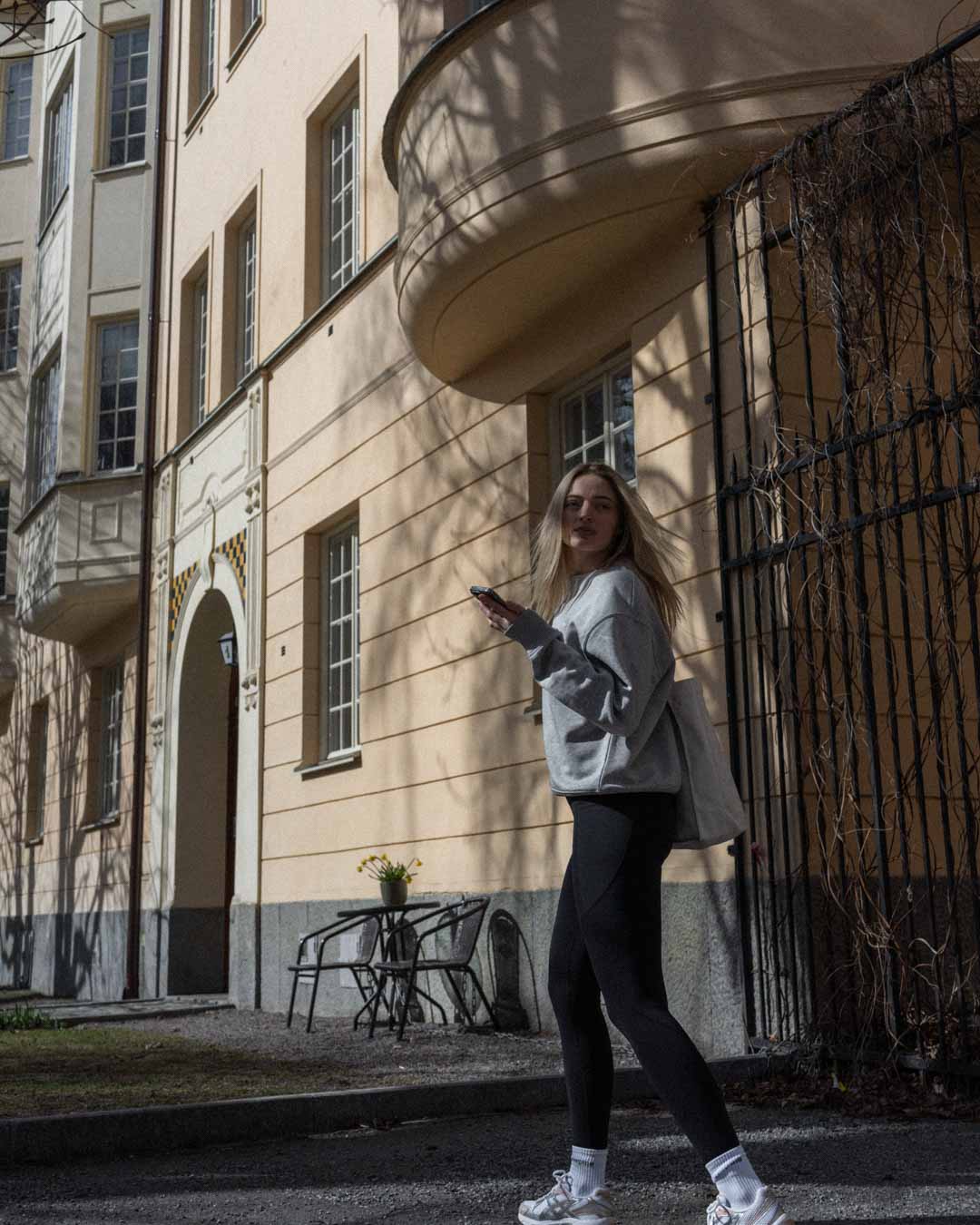 Spring activewear vibes in the historic suburbs of Stockholm, Sweden. From workout to everyday errands, Louise displays the versatility of Ninepine's activewear.