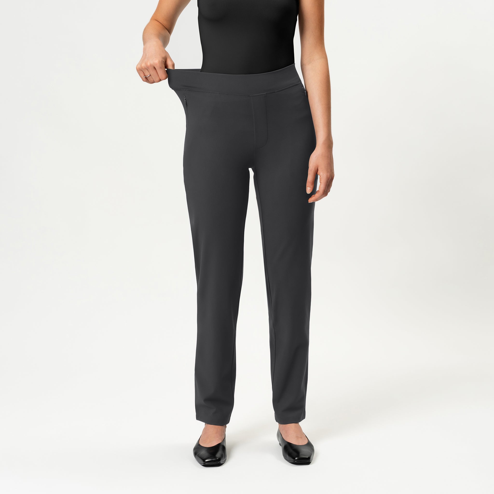 Asana Slim Pant, peach-soft, slim ankle-length trousers blending tailored style with loungewear comfort. For an ankle fit, choose a length 2" or 4" shorter than your relaxed pants. Featuring discrete zip pockets, a high centrefold waist, and a brushed activewear knit, they're ideal for your everyday, work, travel, and lounging.
