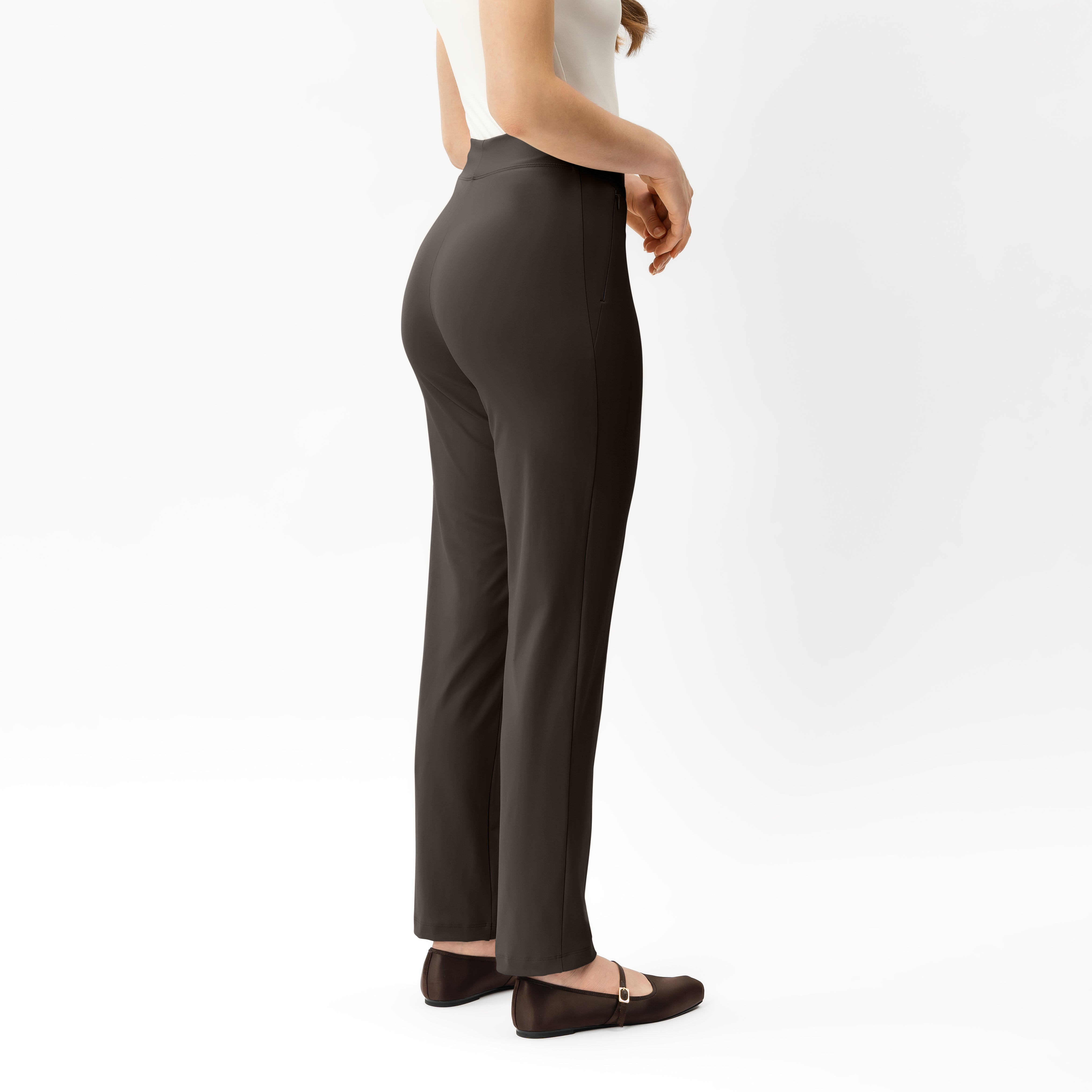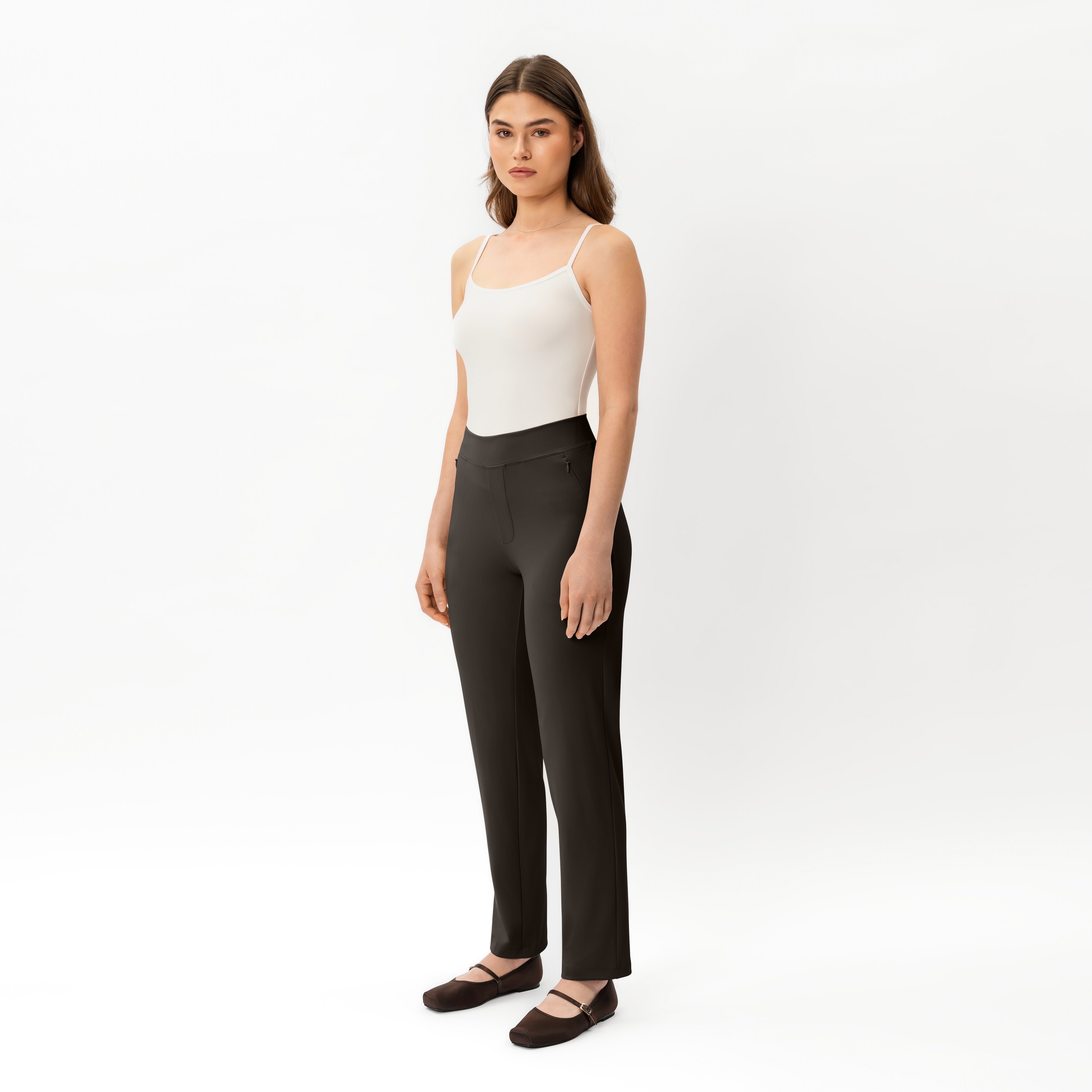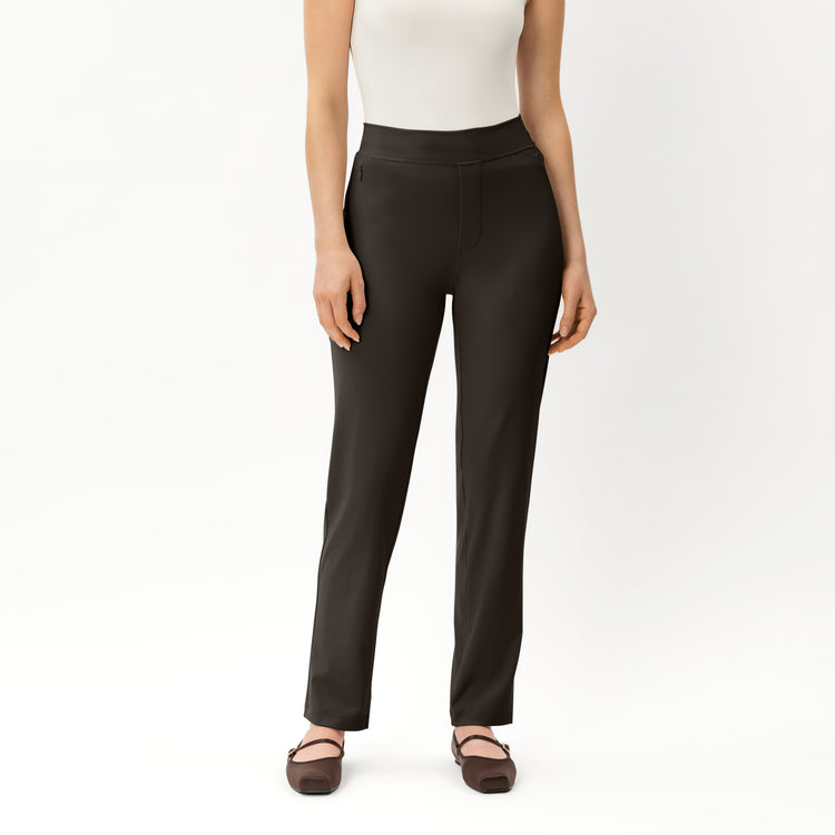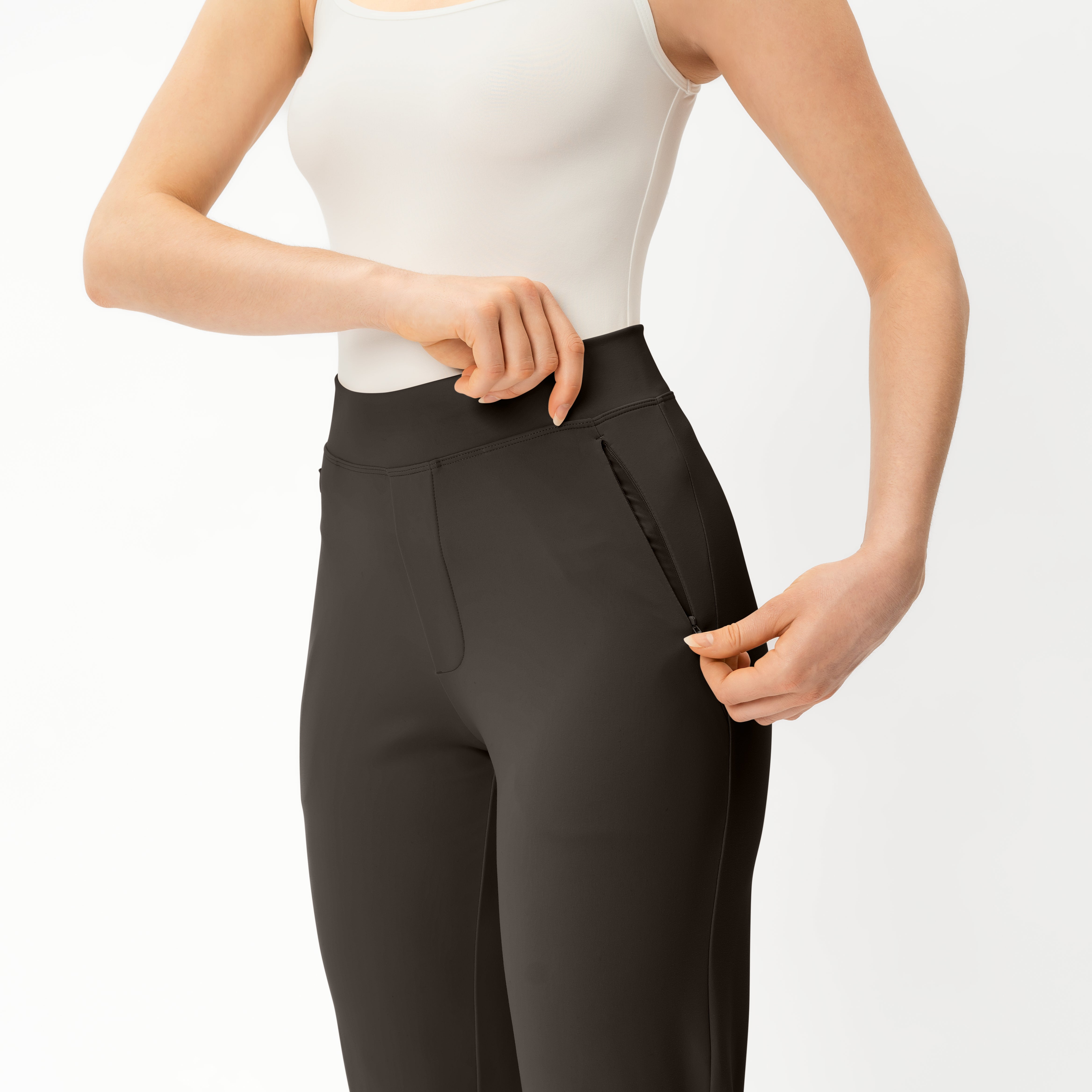 Asana Slim Pant, peach-soft, slim ankle-length trousers blending tailored style with loungewear comfort. For an ankle fit, choose a length 2" or 4" shorter than your relaxed pants. Featuring discrete zip pockets, a high centrefold waist, and a brushed activewear knit, they're ideal for your everyday, work, travel, and lounging.