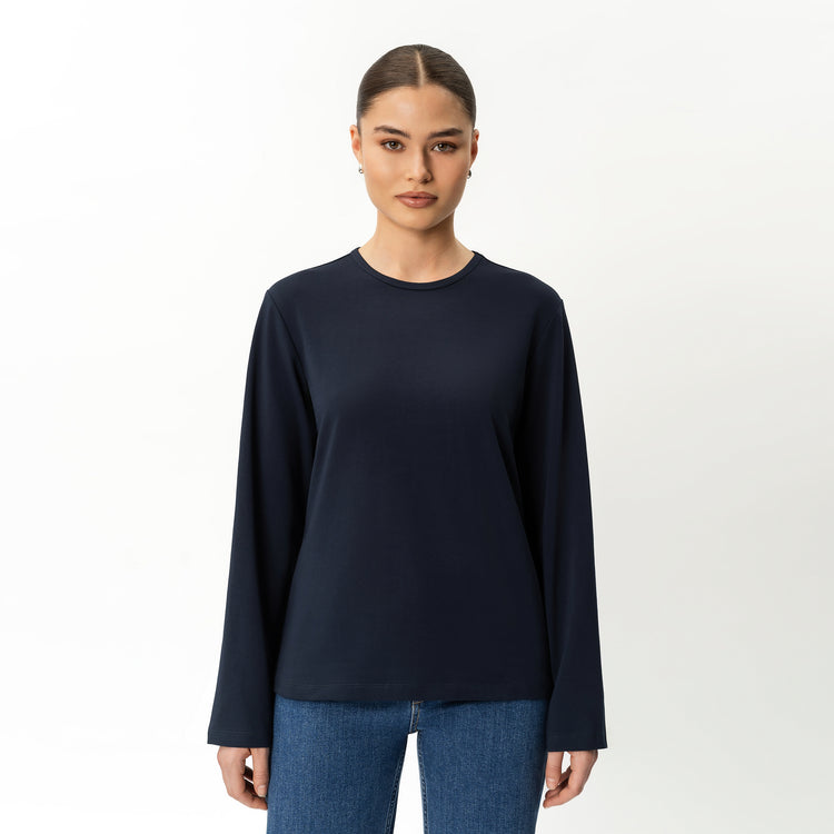 This long-sleeve, classic-fit t-shirt is made from luxuriously soft, combed 190gsm Pima cotton with added stretch for comfort. Pima cotton—known as the finest cotton available—offers superior softness, durability, and a refined feel that sets it apart from standard cotton.