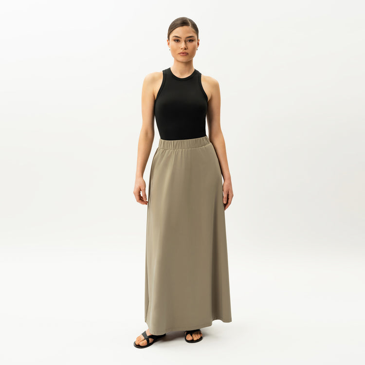 A versatile pull-on skirt with a relaxed, subtle A-line shape for ease of movement. Designed with a soft drape, elastic waistband, hidden pockets and side slit for all-day comfort and flexibility. Available in two lengths to match your style.